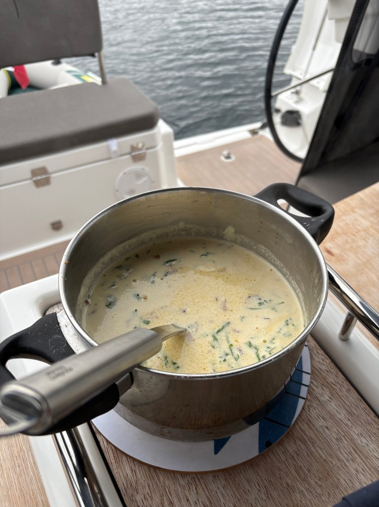 Vi hadde med oss kantareller fra Kiwi på Sætre i dag, vi hadde med rømme, bacon og smør, det er gitt at det blir god mat av sånt. Kantarellsuppe hører ettersommeren til, og aldri smaker det bedre enn ombord i en seilbåt. Vi er blitt de mest ekstreme livsnytere, er vi i ferd med å bli hedonister av ypperste klasse? God vin, god mat, ny, elegant seilbåt, vi nekter oss ingen ting! Nu vel. I øyeblikket renner regnet ned over vårt aktertelt, vi er tørre og tilfredse etter en av de bedre suppene i Indre Oslofjord 2025, og orker ganske enkelt ikke be om mer. I hvert fall ikke helt enda.
