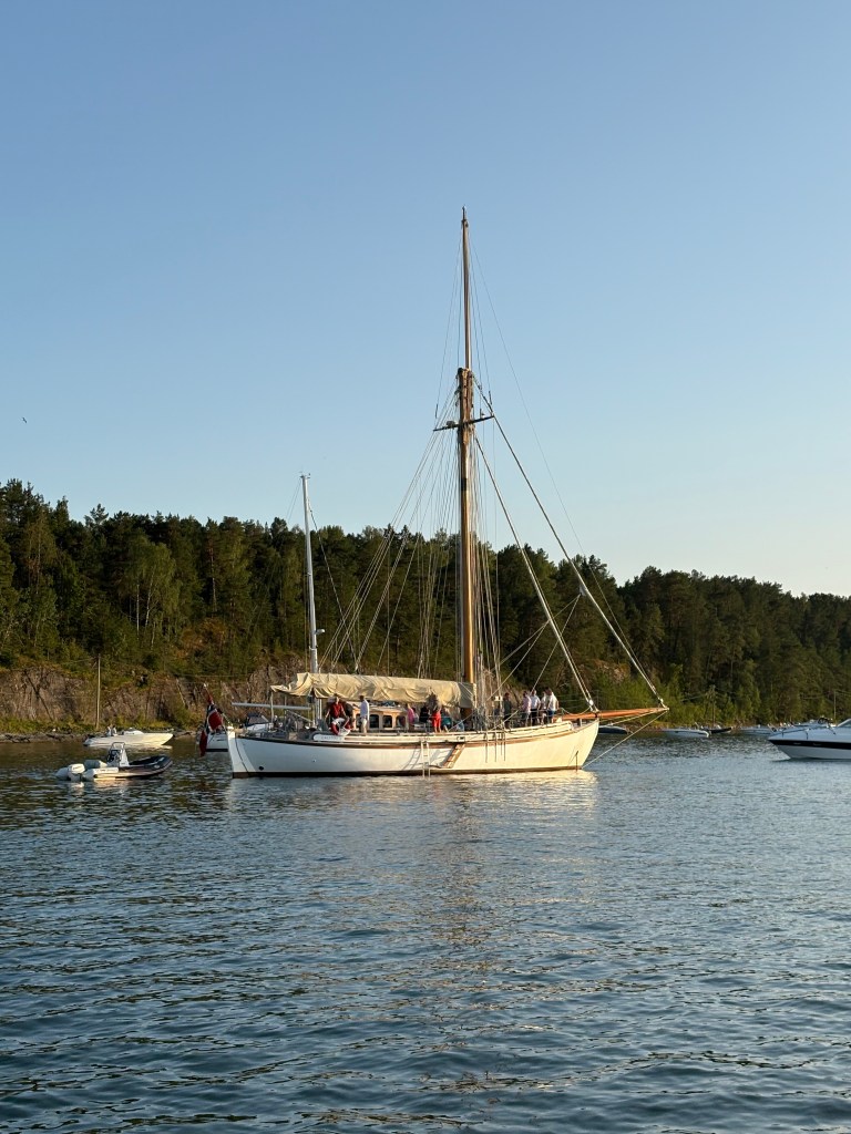 Där blev vi bjudna ombord på en riktig pärla: den vackra Collin Archer-båten Calliope V. Håkons jobb hade teambuilding på hög nivå – räkor, vin, öl och bad. Att Håkons chef råkar äga denna skönhet? Ja, det är sånt som gör att man nästan funderar på att börja skicka in CV till hans firma. (HAHA NOT! 😂😂😂 – jag har redan världens bästa jobb!)