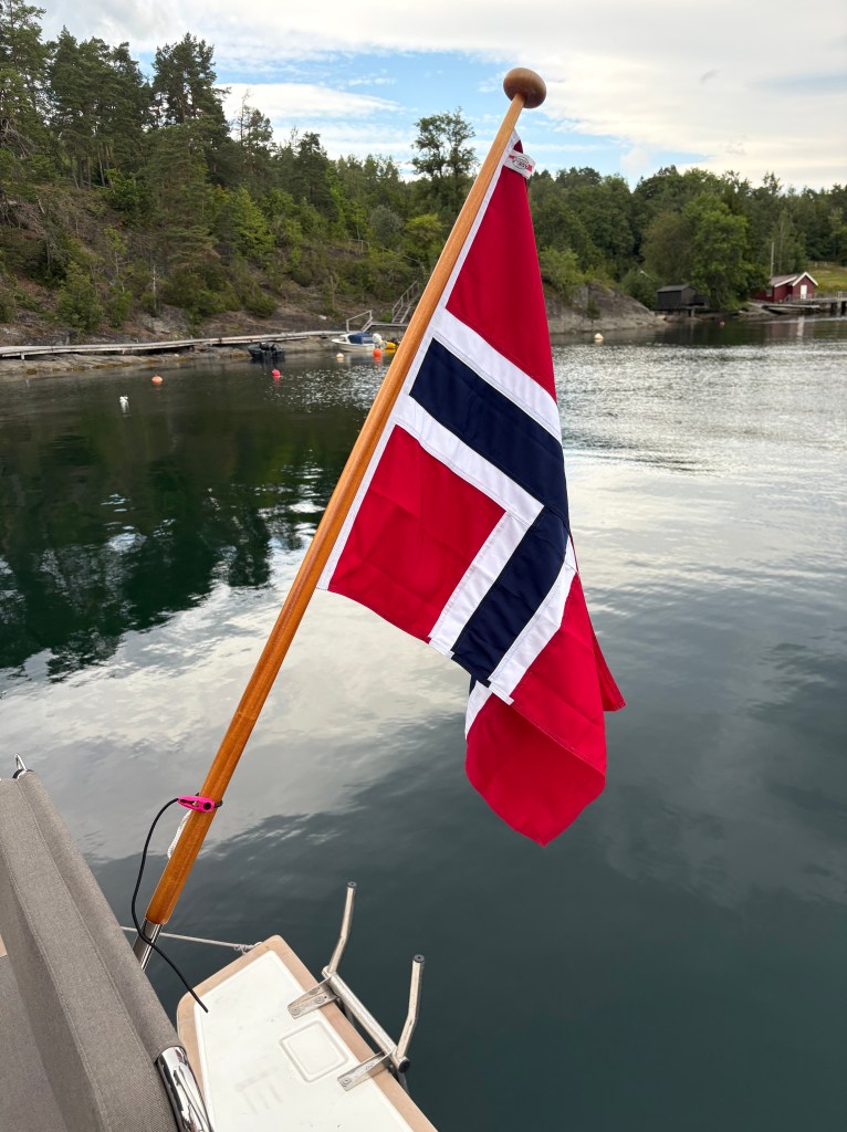 Vi har också bytt till en mindre flagga. Den som följde med båten var, enligt min högst objektiva bedömning, i ÖVERKANT stor och så royalistisk att jag förväntade salut från förbipasserande båtar. Jag flaggar såklart norskt i Norge, men det finns gränser… också för min akter
