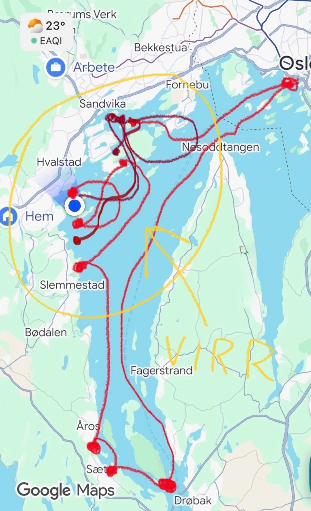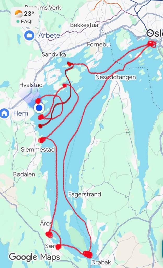 Idag har ”vi” lagt ut från hamn två gånger. Och JAG = MOI, har lagt ut bägge gångerna. Smidig utläggning från Oscarsborg av Moi. Styrde skutan mot Sætre med fast hand. Efter att fändermanskapet hade tatt in fänderna, fixat det som skulle fixas så bad jag om att få min flytväst. Med full koncentration på navigationen så låg plötsligt min flytväst mellan mina fötter och blåste så baköver rätt ner i havet.