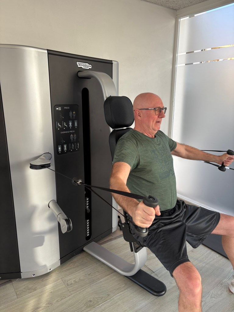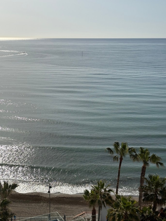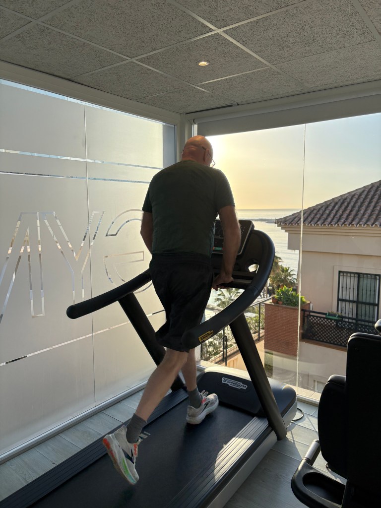 Verkligheten är att jag har sovit gott inatt! Gott för mig betyder att jag bara är uppe 5 gånger och att jag somnar om relativt fort. Medelhavets vågor har böljat in över stranden hela natten som bästa Yoga-piller. Det var egentligen bara att välja när det var dags att öppna ögonen och släpa en tämligen ovillig man till hotellets gym.