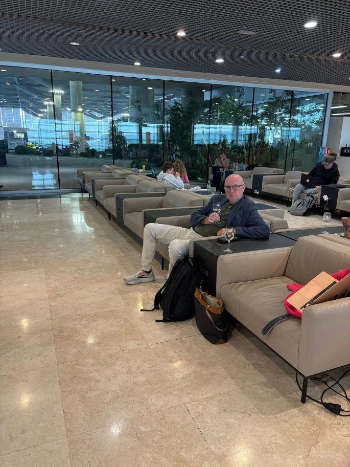 Idag har vi intressant nog startat förmiddagen med ”light-beaming”. Beamade direkt från hotellfrukosten in i en lounge på Malaga flygplats, utan att passera gå. Det är faktiskt inte så illa med flygplatser när man får gå före i kön, sitta i stillhet, lugn och ro, äta gratis mat och dricka gratis vin (klockan är över 12, jag är ju civiliserad!). Det finns till och med toaletter med riktig dörr på.