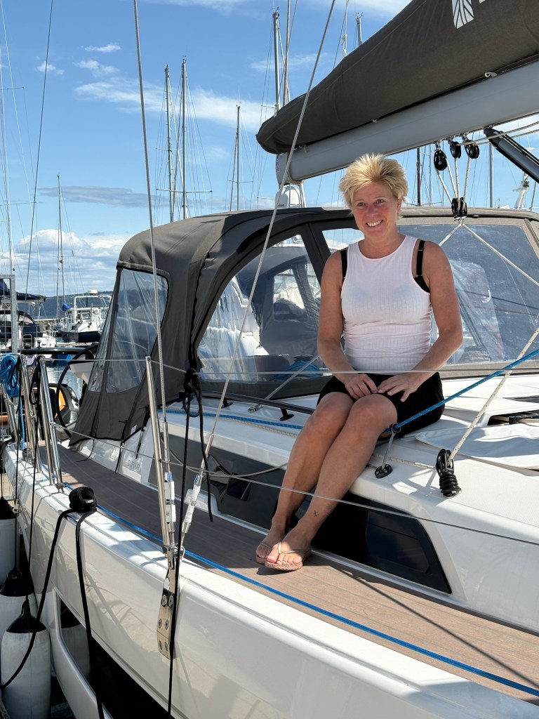 För här seglar en stolt kapten. Och Jag sitter i en helt ny salong på våra egna fårskinnsplädar (jaja, det är 25 grader ute men ändå skönt med lite fårskinn). Fönstrena i salongen är så låga att det känns som jag sitter i vattnet och skriver. Har klarat att laga mat på den nya spisen och att diska i den nya vasken, duscha i den nya duschen. Snart ska jag lägga mig i den nya breda nybäddade sängen med rena lakan.