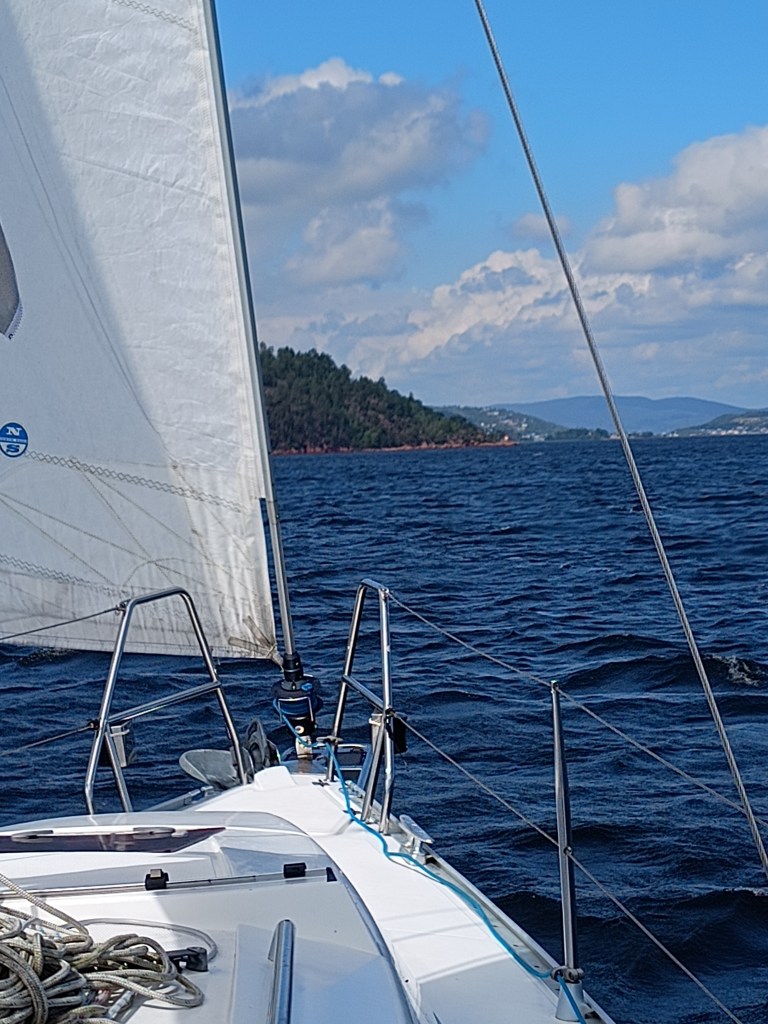 Sista halvtimman av dagen seglats var riktigt fin. Vinden bakifrån och 5-6 knop med bara focken.
