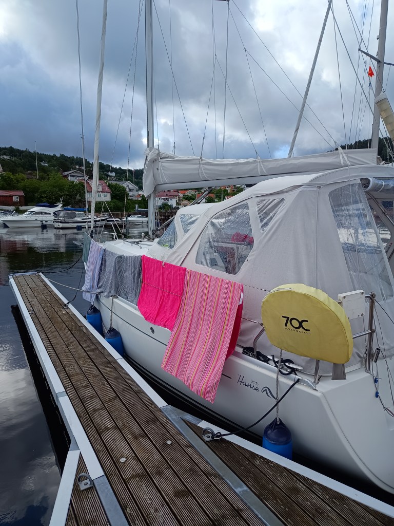 En dag utan tårar, en dag i gästhamnen på Holmestrand. Åh så härligt! Vi åker inte ut på havet när Yr hotar med åska överallt hela dagen.