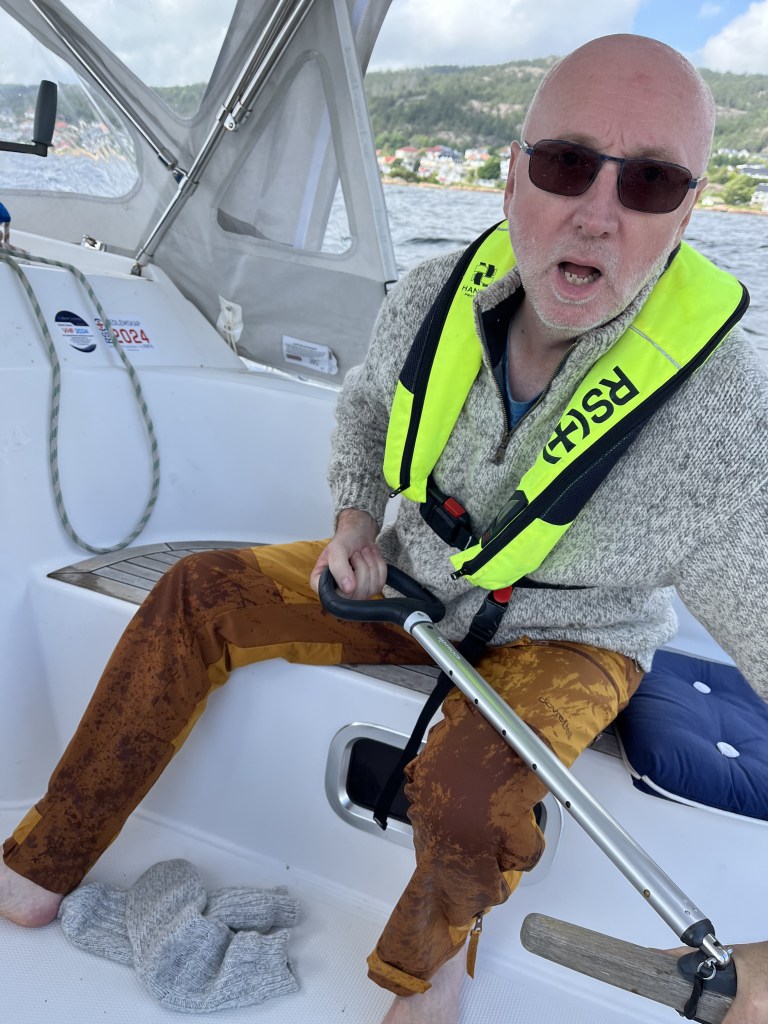Vi har ligget her hele dagen, vi har også ventet. Heldigvis gikk det hele ganske bra, men der ute på sjøen har helvete vært løs, så vi har tatt rett valg, for en gangs skyld. Antall lyn der ute har vært omtrent likt med det antall skritt vi har tatt rundt omkring i gatene og opp på ”fjellet”, der industrien og faghandlene ligger som perler på en snor. Vi måtte ha et nytt båtflagg, men sånt finner du ikke nede ved havna der sånt behøves. Neida, du må ”opp på fjellet”, sa de lokale stammene til oss. Dovre, foreslo jeg. Nei, sa de. Bare opp på platået, så fektet de litt sånn slurvete inn over land et sted. Men vi gjorde unna det viktigste først, nemlig rusmidlene. Heldigvis finnes et statlig utsalg i en av de dystre bakgatene i byen, dette ligger i gangavstand fra vårt staute skip, som nå ligger longside ved strandpromenaden. Hint til havnefolka i Holmestrand følger: Det er plass til ca. 3 ganger så mange gjester om du legger dem side om side med baugen inn. Do the math.