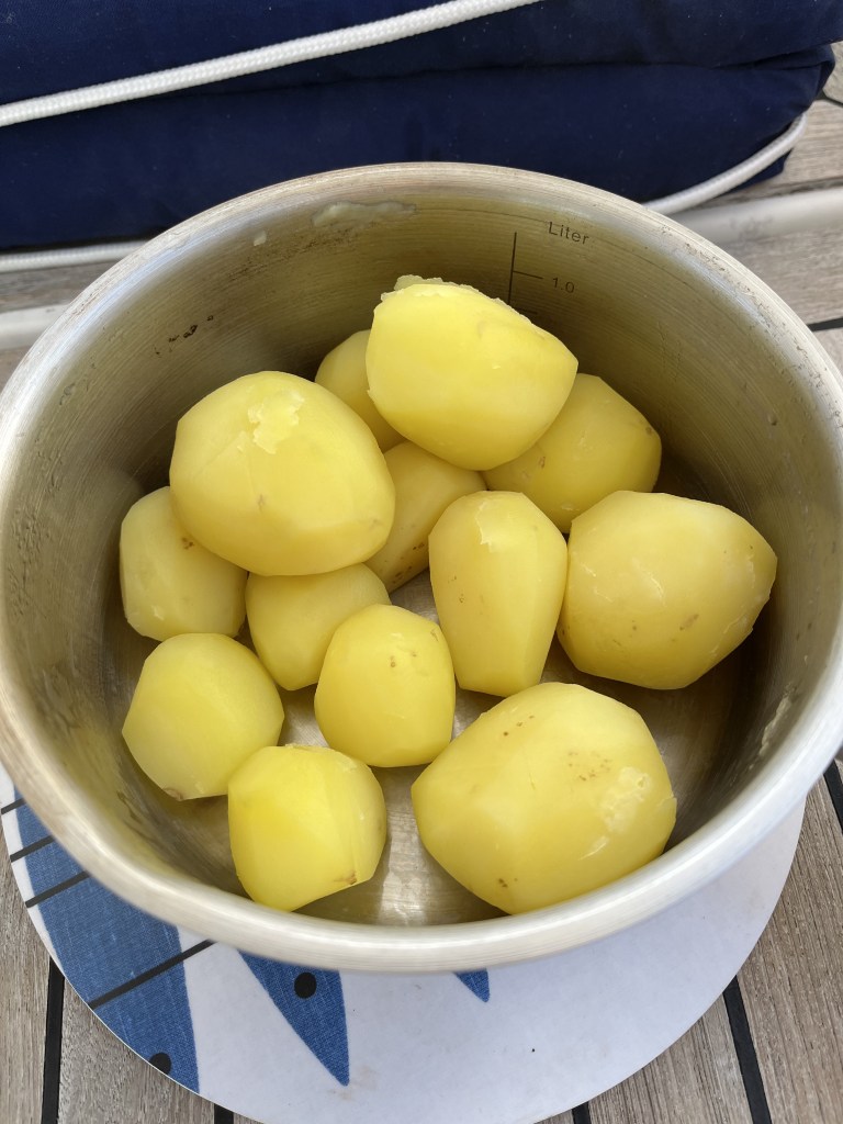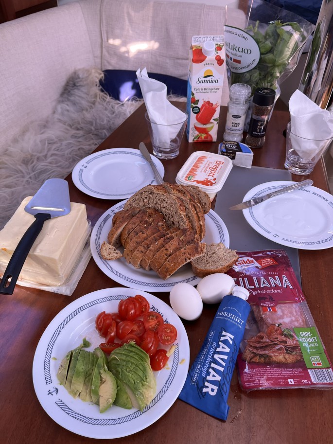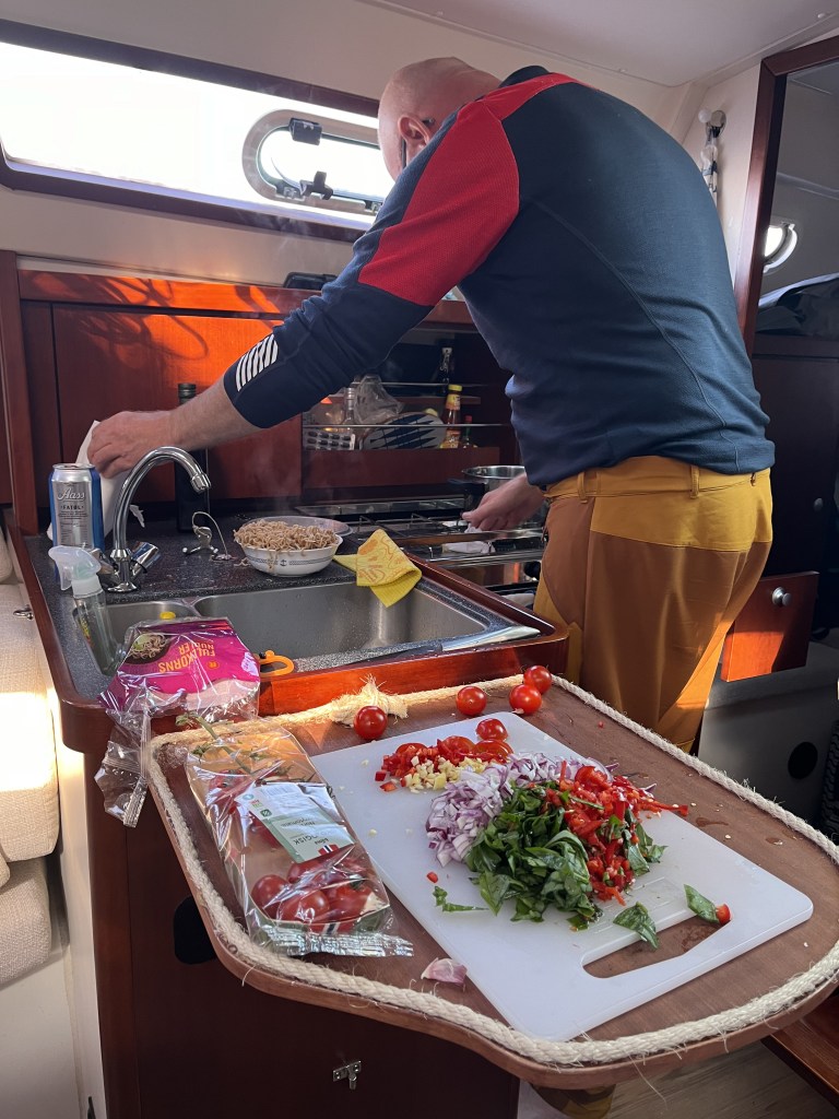 Håkon lagade middag idag. Och det blev jättegott! Lika gott som de andra dagarna när Jag har lagat middagen. Men se på det KAOSET! Man kan inte laga mat på en båt som man lagar mat hemma. Man måste planlägga, minimalisera, mise en place, förbereda, organisera, smyga, tassa för att så langa upp i sittbrunnen.