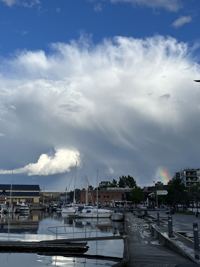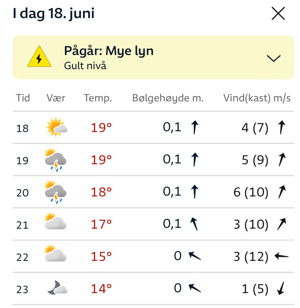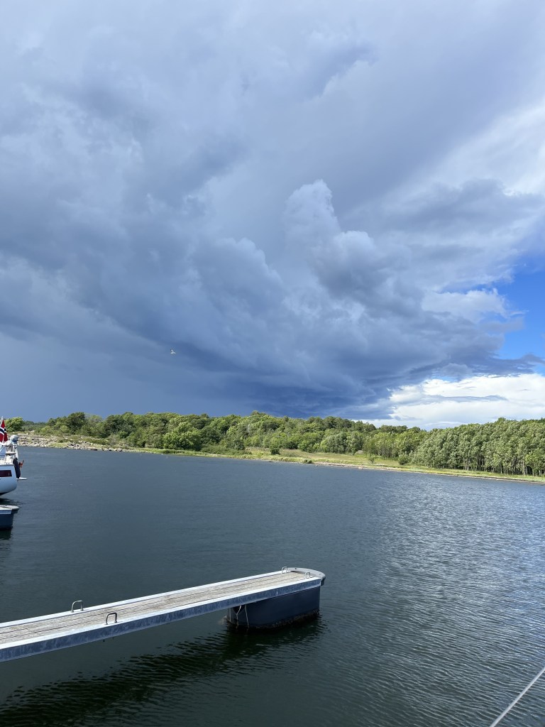 Litt kjipt det der med været. For to år siden hadde vi mye av samme greia da vi seilte sørover den svenske Västkusten; vind og temperatur var så absolutt ikke på vårt parti. Strategien om å legge ferien tidlig for å fange godværet og unngå torden, har hittil vært noe i nærheten av en fadese. Med morgendagens værmelding tatovert i repilthjernen, har vi i dag bevet oss med museskritt, og har nå bundet oss godt fast i gjestehavna inne i Holmestrand by. For det er torden på gang. Ingen höjdare for godværsseilere, egentlig ikke for de dumdristige, heller, når sant skal sies, Ergo er vel planen å bli her i morgen, gitt at ikke værmeldingene endrer seg radikalt i løpet av natten.