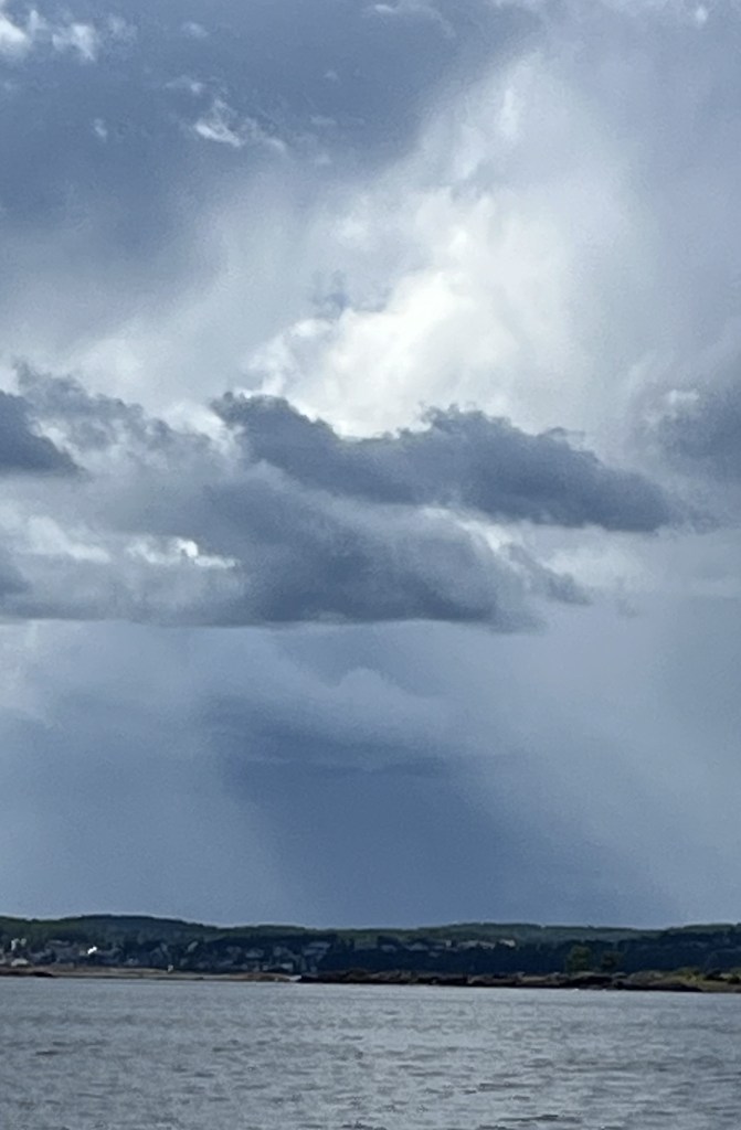 Vi har levd med trusselen om at himmelens vrede skulle vederfare oss hele denne dagen. Svarte, ondskapsfulle skyer har hengt over havna fra tidlig morgen, helt til de skruppelløst angrep oss. Men vi hadde forutsett planene, og hadde barrikadert oss i en italiensk restaurant, med pizza, vin, kors og vievann. Vi holder stand!