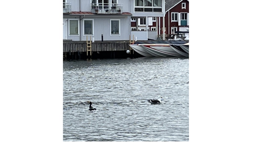 Vi har kjørt E6 i dag, på sjøen. En endeløs rekke med norske, tyske, danske og svenske båter, med enkeltinnslag fra Litauen, Nederland og Finland, flommer i begge retninger. Västkusten fremstår som stor i areal, men er underlig trang, når man begynner å seile (eller tøffe med motor) langs den farbare ”vei”. Det er trangt, det er enormt mye å ta hensyn til hele tiden. Ferger, seilbåter, cabincruisere på 60 fot som ikke evner eller gidder ta hensyn til almen trivsel, samt alt det jeg nevnte i går, selvsagt. Og langs denne sjøens E6 finner vi dessuten fuglerikets svar på selve Satan, svart og jævelig står han der og brer ut sine vinger som til et dystert kors, og fremstår som et dårlig omen for båtfolket. Dette er Storskarvens rike!